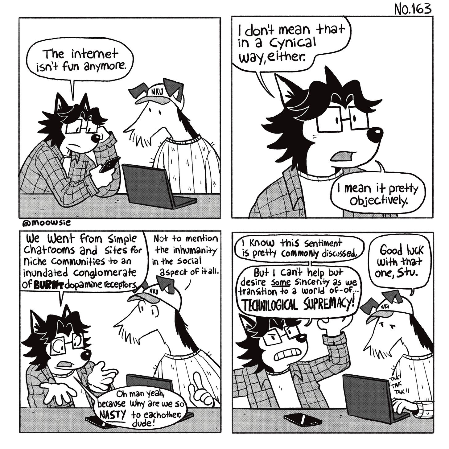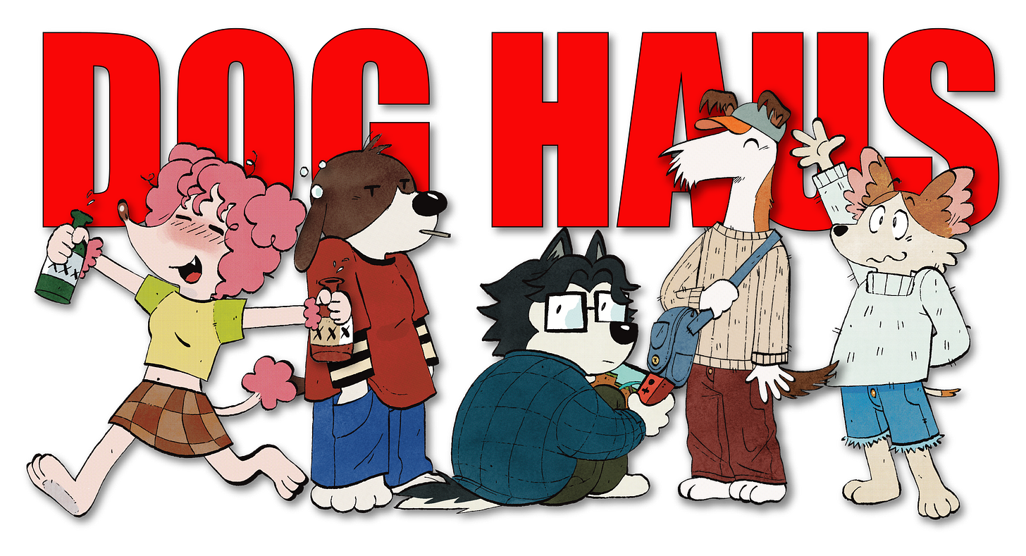 DOGHAUS was very unplanned in the beginning. It was more of a stream-of-consciousness in the depths of my junior year of college. I was kind of all of the characters split into four pieces. Over time, as I began to take it more seriously, I started taking the time to approach the characters with more individual goals in mind for their stories. When I took the time to really develop them, there was a lot more to explore.